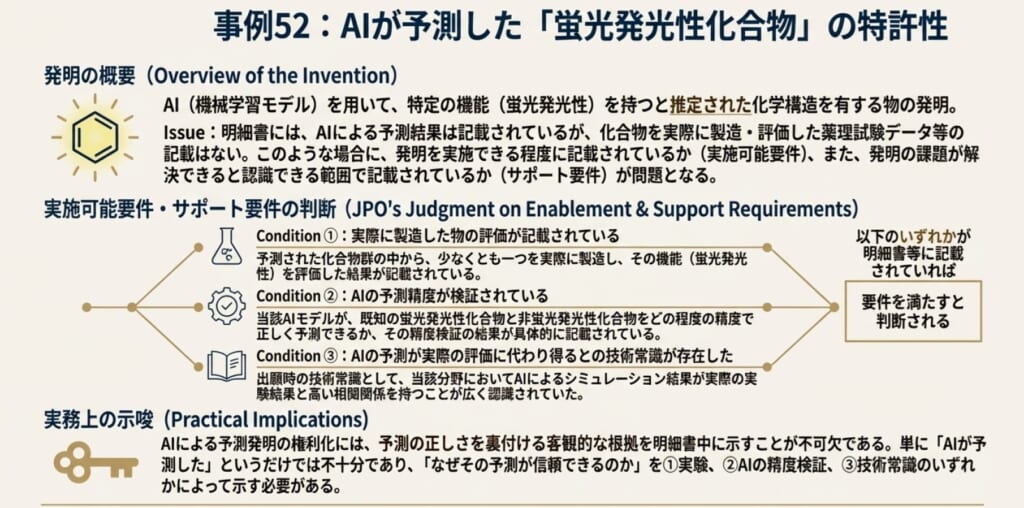 コメント:特許庁の事例52では、①実験結果、②AIの予測精度の検証、③当該分野における技術常識のいずれかが明細書等に記載されていれば、実施可能要件・サポート要件を満たすと整理されています。一方で、現時点(2025年12月)では、①に該当する、実際に製造した物の評価結果を記載した事例のみ確認できており、②または③のみを根拠として権利化された特許権は把握しておりません。そのような事例を確認できましたら、改めてご報告いたします。